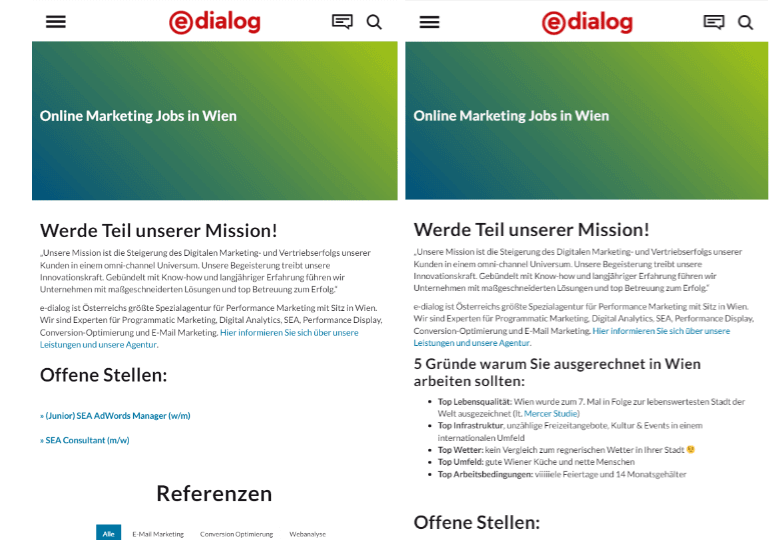 Mit Optimize360 können nun einzelnen Usern unterschiedliche Inhalte ausgeliefert werden, die ganz zielgerichtet auf sie abgestimmt sind z.B. auf Basis von Standort Daten, Demografischen Daten, Kundendaten, etc. Als Praxis Beispiel nennt Stepke die eigene Job-Suchseite auf e-dialog.at: Hier werden je nach Standort des Users unterschiedlich relevante Inhalte ausgespielt. Kommt der User z.B. aus Deutschland, so werden ihm 5 Gründe aufgelistet, warum er ausgerechnet in Wien arbeiten soll. Wiener hingegen werden natürlich nicht mit dieser Information „genervt“.