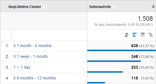In unserem Blog erfassen wir beispielsweise das Alter des Artikels zum Zeitpunkt des Aufrufs als Custom Dimension. Das würde uns einen ziemlich unübersichtlichen Report liefern, daher haben wir noch das Alter geclustered, wie man hier schön sehen kann:
